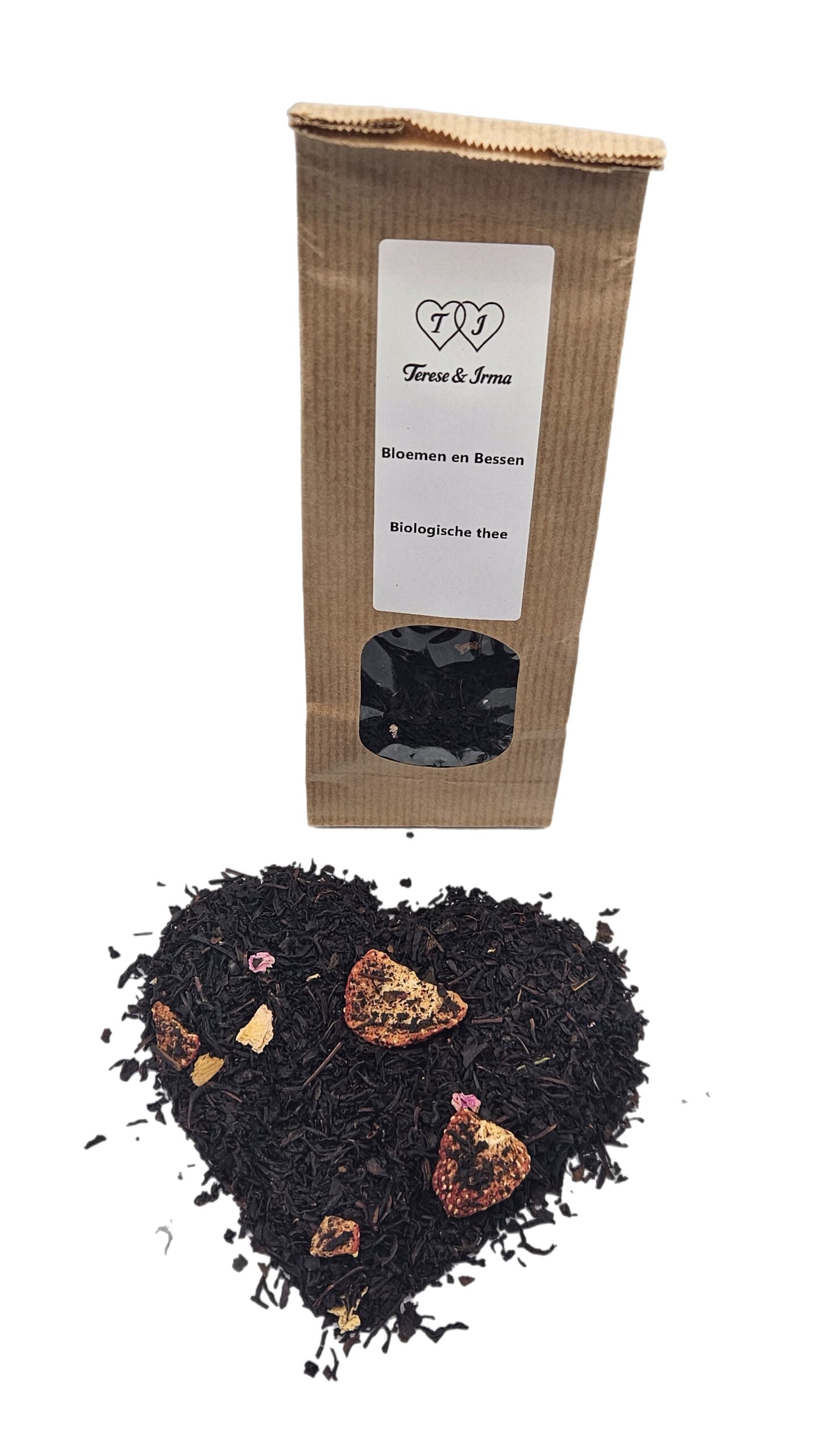 Bloemen en bessen: een harmonieuze dans van thee, fruit en bloemen en een biologische melange vol natuurlijke pracht en dubbel geluk in elke slok.