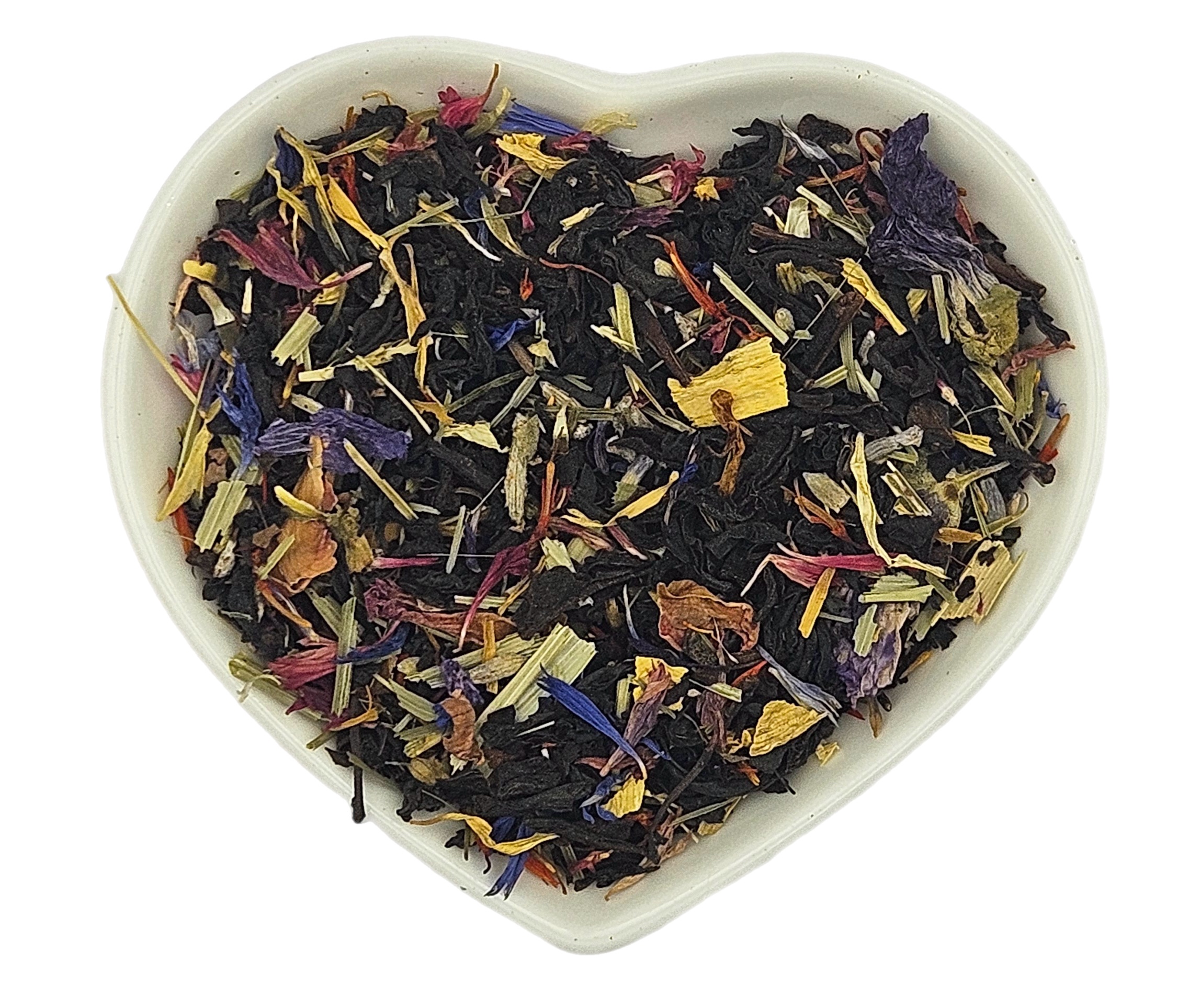 Deze zwarte bloementhee is een elegante en kleurrijke melange waarin de diepe, volle smaak van zwarte thee wordt omringd door een zachte bloemige harmonie. Gerstegras brengt een frisse groene ondertoon, terwijl lavendelbloesem, rozenblaadjes en korenbloemblaadjes zorgen voor een verfijnde geur en een sierlijke uitstraling. De toevoeging van goudsbloem, zonnebloem, saffloer en kaasjeskruidbloesem geeft de thee een levendig karakter en een subtiele natuurlijke zoetheid. Het geheel wordt afgerond met een natuurlijk aroma dat de smaken mooi met elkaar verbindt.