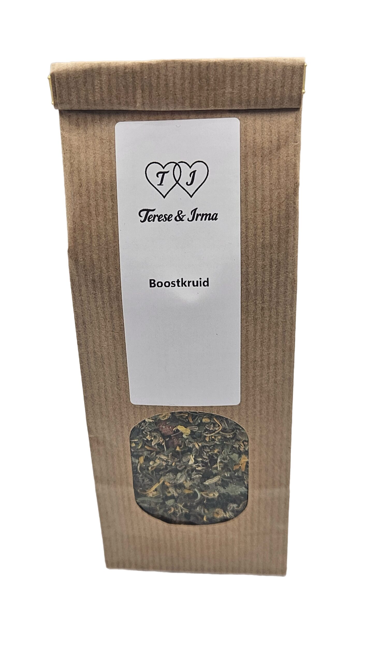 Boostkruid is een melange die je energie geeft en je zintuigen verfrist. De krachtige basis van ribkruid en rozenbottelschil wordt verrijkt met de verkwikkende helderheid van pepermunt, terwijl bram- en frambozenbladeren een zachte, groene ondertoon toevoegen. De kruidige warmte van venkel en hele anijs geeft de blend een aromatische diepte, subtiel omlijst door de lichte zoetheid van appelstukjes. Vlierbloesem, goudsbloem, pioenroos en zonnebloembladeren brengen een bloemige harmonie die de thee een elegante en zonnige afronding geeft. Het resultaat is een kruidige infusie die voelt als een natuurlijke oppepper. Een thee die je lichaam en geest een zachte boost geeft.