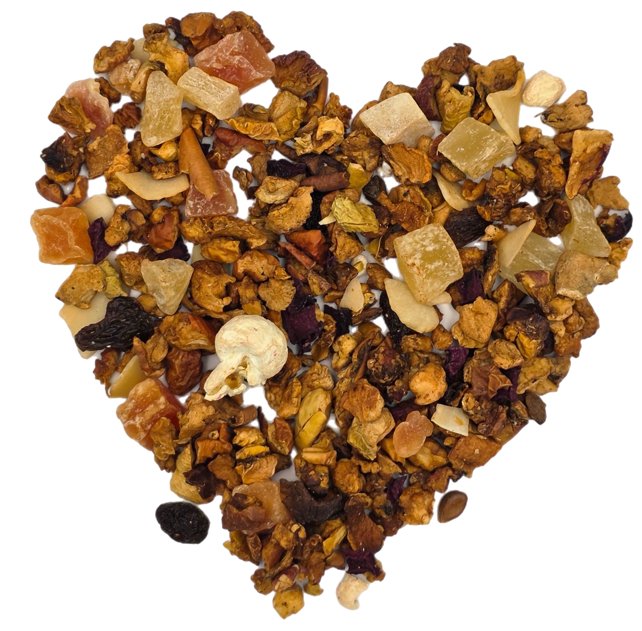 Ingrediënten: Appel, ananas (ananas, suiker), papaja (papaja, suiker), druif (druif, plantaardige olie), kokosnoot (kokosnoot, kokosolie, suiker), biet, kaneelstokjes, aroma, amandel (2%), popcorn.