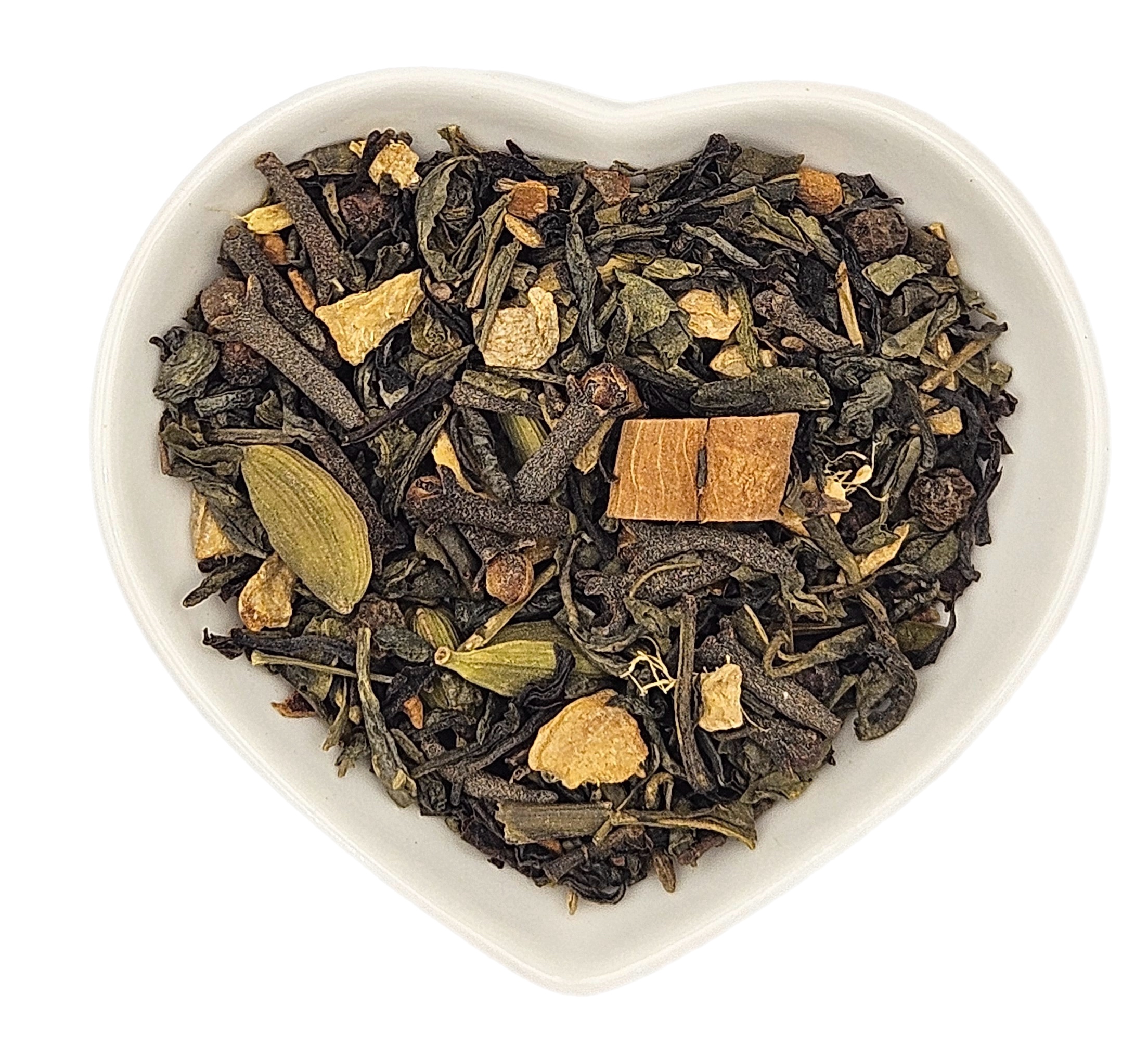 Ingrediënten: Groene thee, zwarte thee, gember, kruidnagel, kaneelrolletjes, kardemom, zwarte peper, kaneel.