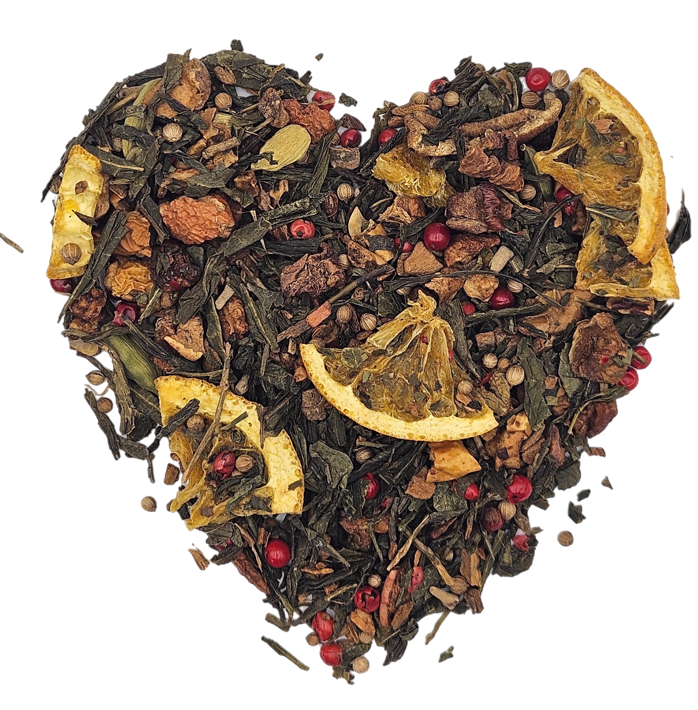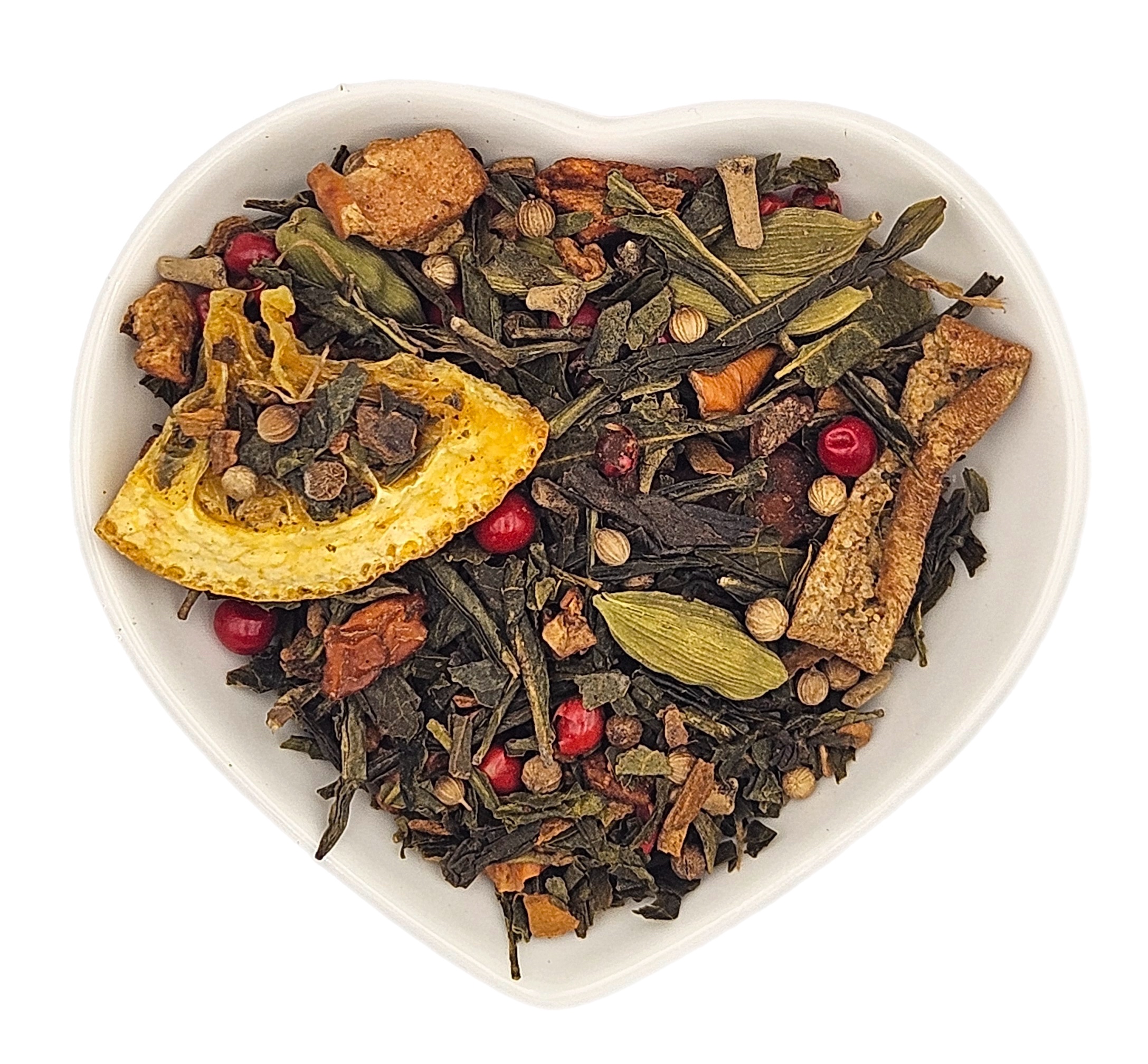 Groene Verleiding is een speelse, aromatische melange waarin groene thee wordt omhuld door de zoete zachtheid van appelstukjes en de zonnige frisheid van sinaasappelschijfjes. De kruidige warmte van kaneel, kardemom, koriander en kruidnagel geeft de blend een dieper, uitnodigend karakter, terwijl een subtiele prikkel van rosa peper zorgt voor een verrassende twist. Het resultaat is een thee die zowel fris als kruidig is, een verleidelijke balans tussen lichtheid en warmte.