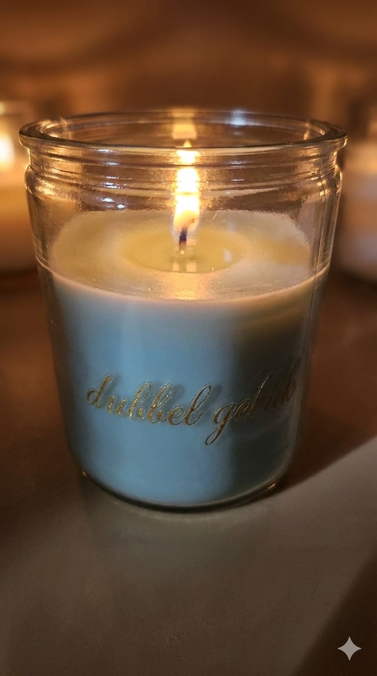 Deze blauwe kaars in glas brengt een gevoel van rust, warmte en verfijning in elke ruimte. Het diepe blauw straalt sereniteit uit, met daarop onze gouden slogan dubbel geluk. Een belofte van twee keer zoveel sfeer in één stijlvolle kaars.