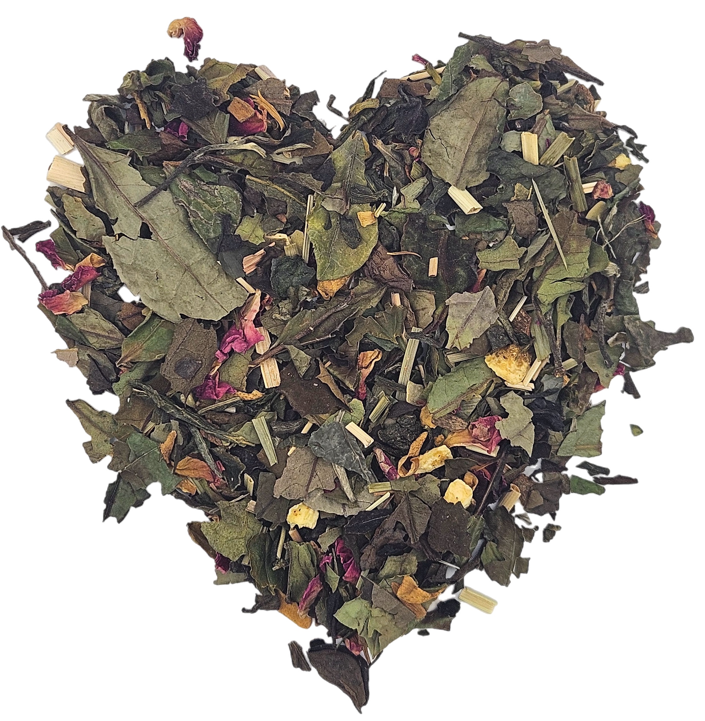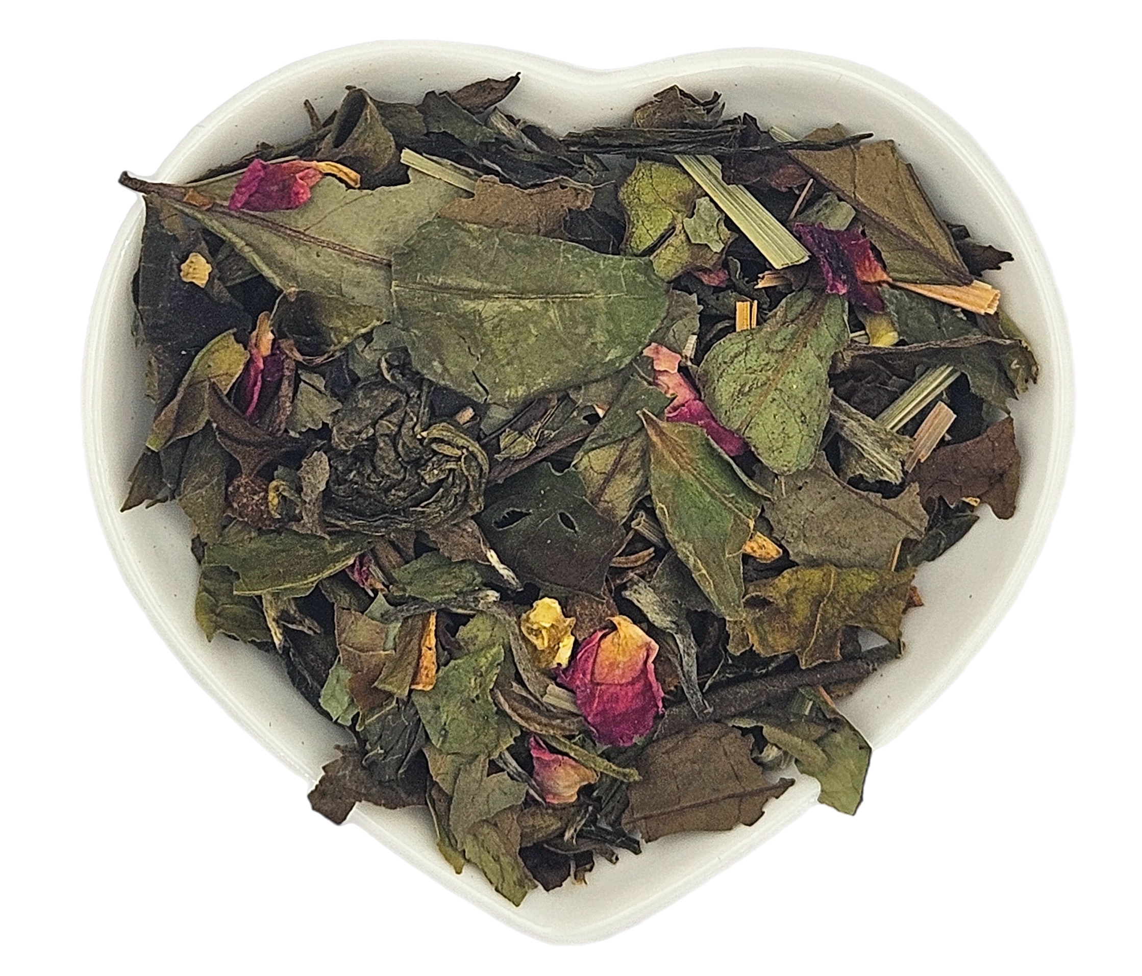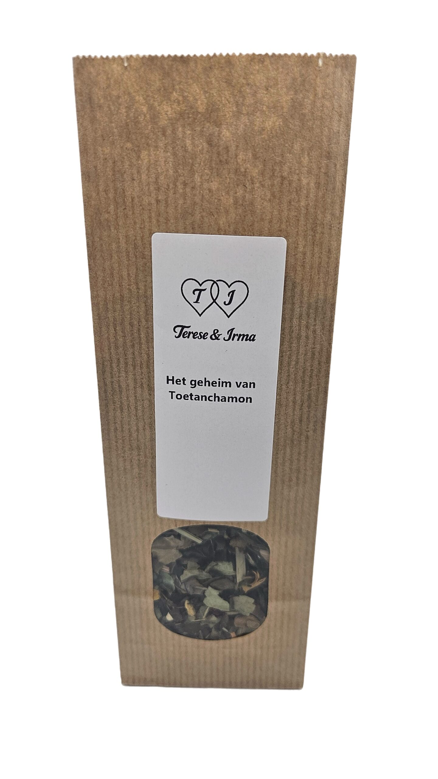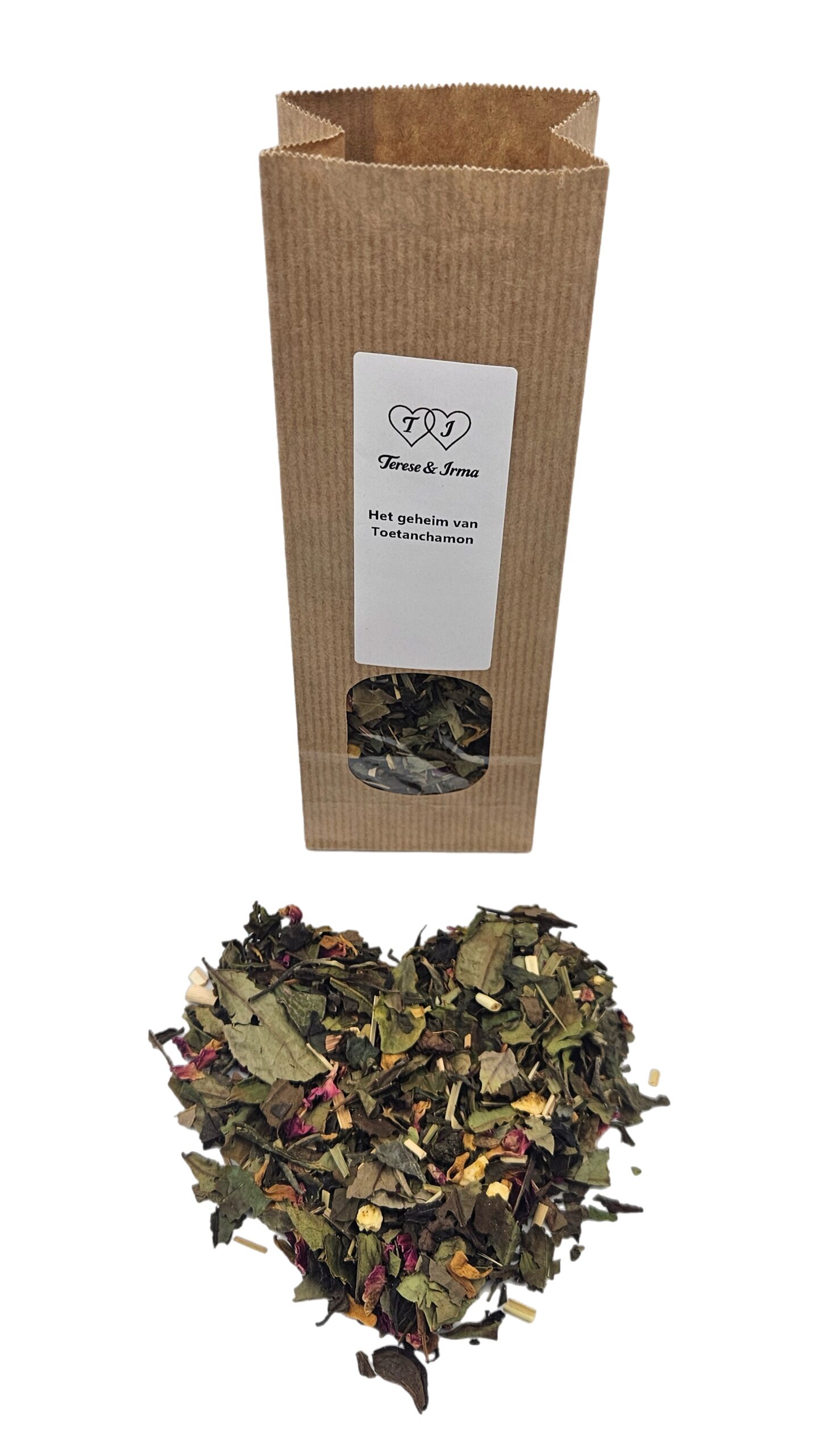 Het Geheim van Toetanchamon is een verfijnde melange waarin witte en groene thee samenkomen met de frisse tonen van citroengras en sinaasappelschil. Cassiabast en natuurlijk kaneelaroma geven een warme kruidigheid, terwijl rozenblaadjes en sinaasappelbloemen zorgen voor een zachte, bloemige elegantie. De subtiele toevoeging van amandel maakt de smaak rond en verrassend. Een thee die mysterie en harmonie uitstraalt, alsof je een verborgen schat ontdekt bij elke slok.