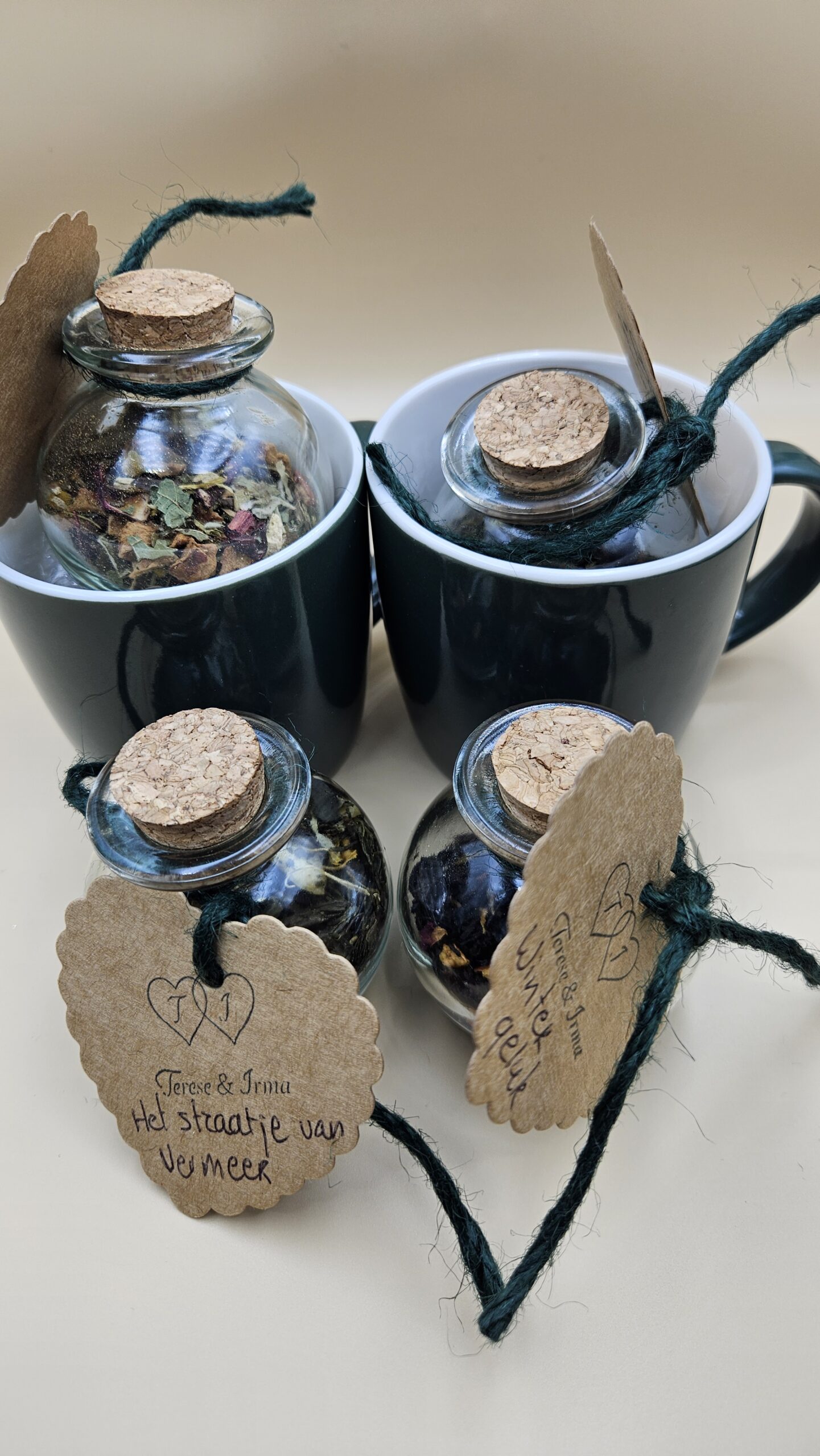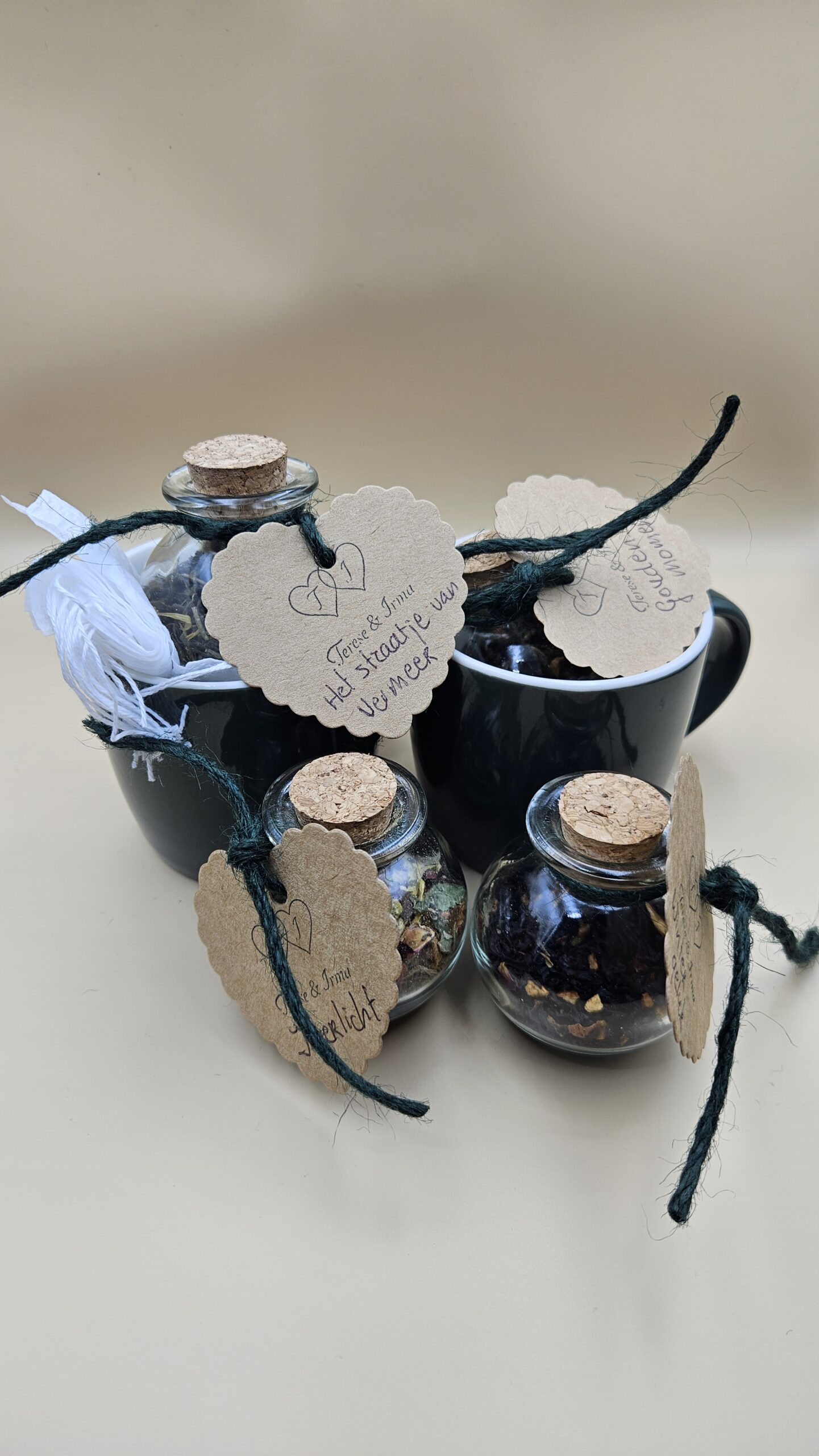 Deze cadeauset is een ode aan aandacht en beleving. Twee groene mokken met een frisse witte binnenkant vormen het hart van dit pakket, klaar om gevuld te worden met vier bijzondere theeën: Het Straatje van Vermeer, Innerlicht, Wintergeluk en Gouden Moment. Elke thee is verpakt in een speels bolvormig buisje met kurk, voorzien van een handgeschreven hartvormig label met onze logo als stempel van echtheid.