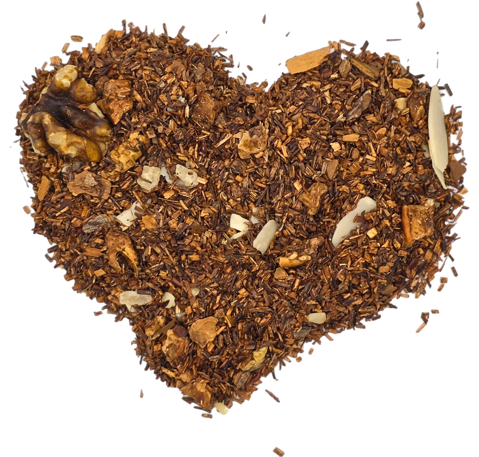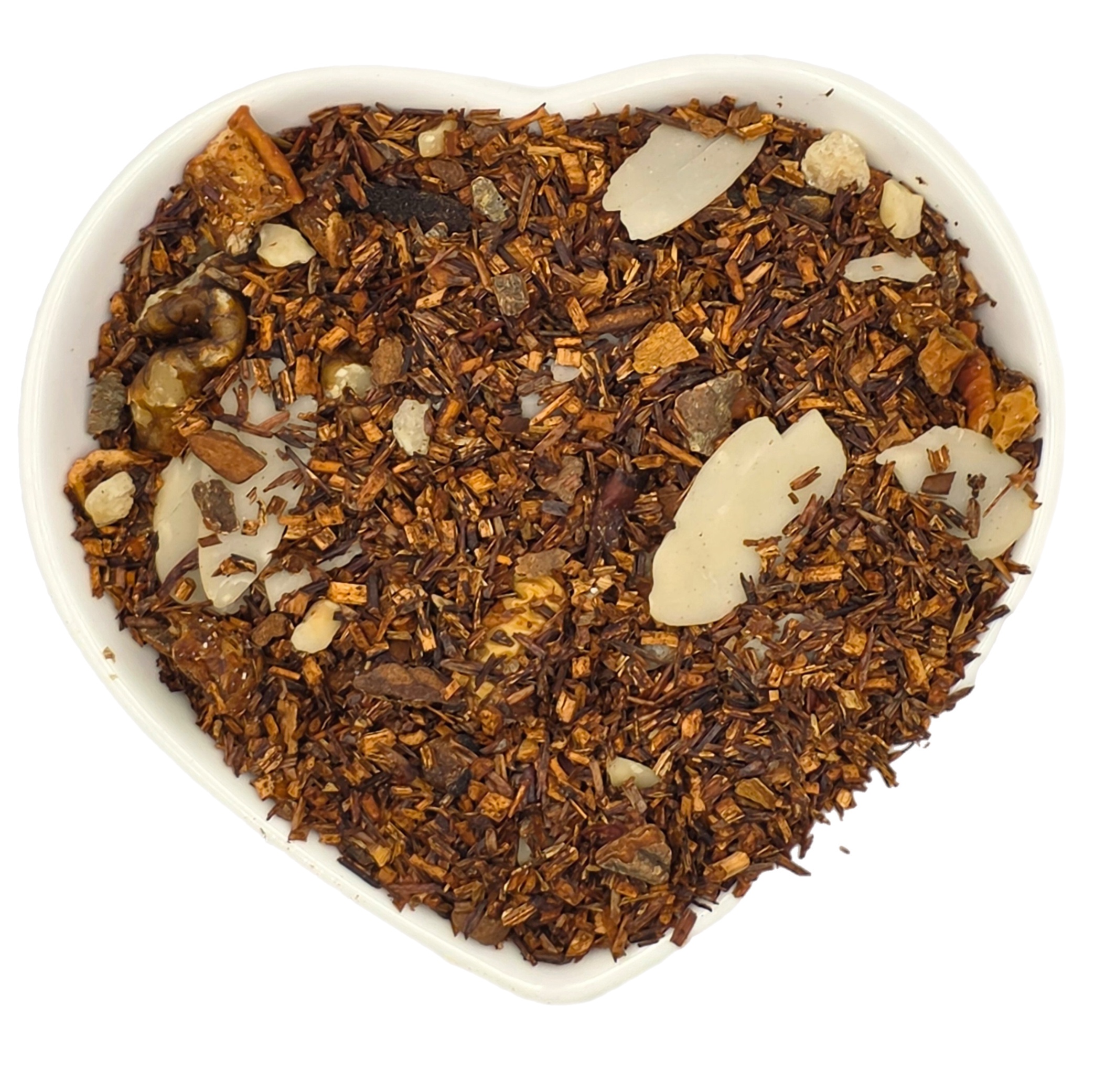 Mysteriethee is een melange die voelt als een warme omhelzing op een koude dag. De zachte basis van Rooibos Super Grade wordt verrijkt met de natuurlijke zoetheid van appel en de rijke diepte van amandel, hazelnoot en walnoot.