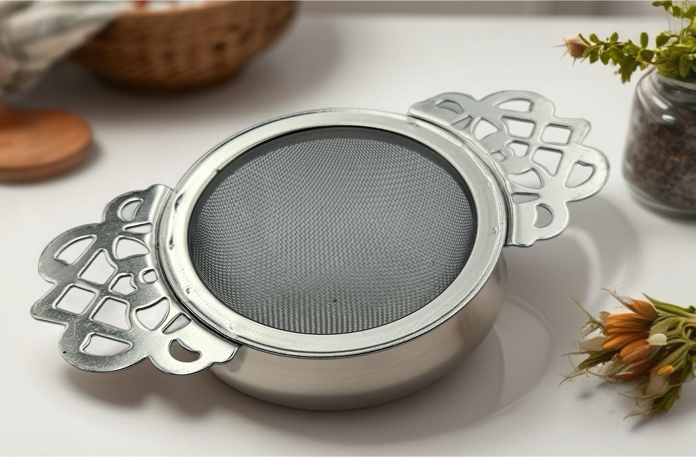 Thee-accessoires – Zilveren theezeef met elegante oren – Stijlvol en praktisch